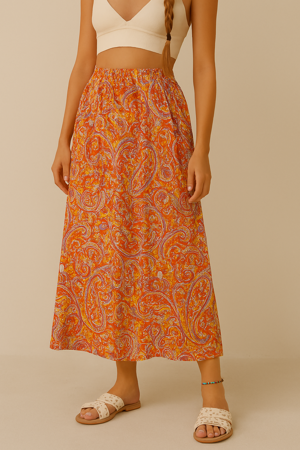 • Mintás maxi szoknya, bralette, fonott haj