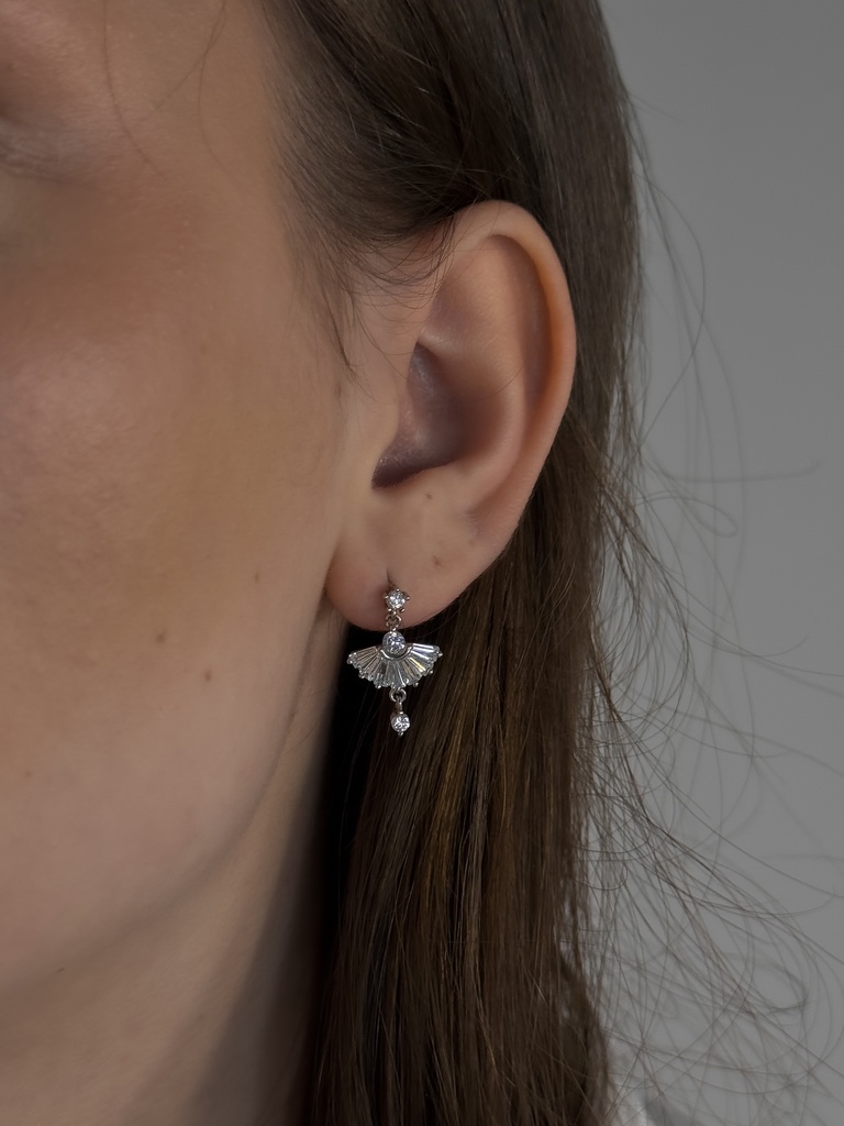 Ez a különleges fülbevaló finoman idézi meg egy balerina kecses sziluettjét: a felső kerek cirkónia a fej, a legyezőszerű forma a szoknya, az alsó függő kristály pedig a mozdulat könnyedségét jeleníti meg. A fülbevaló minden részletében a nőiesség, az elegancia és az aprólékos kidolgozás harmóniája tükröződik.