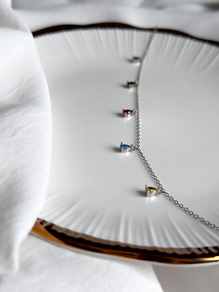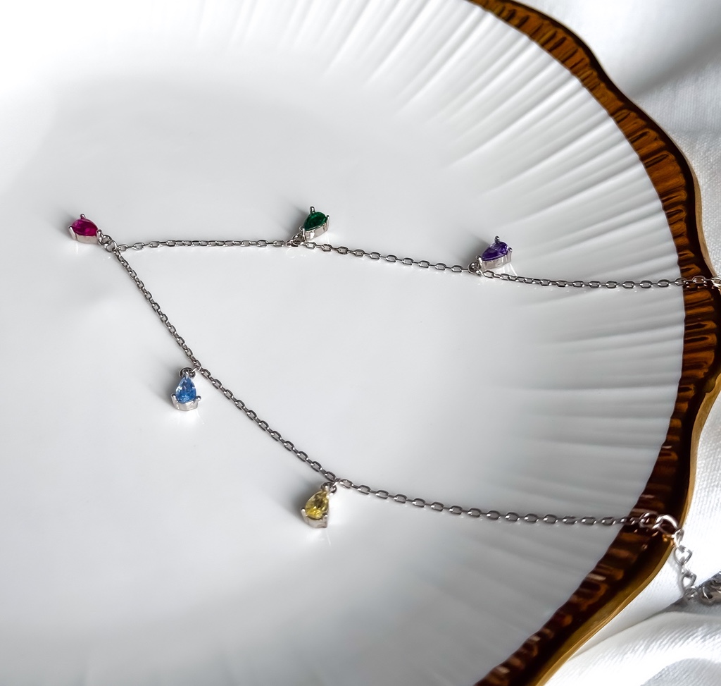 Ez a színes kövekkel díszített 925-ös sterling ezüst karkötő igazi ékszerdobozba illő darab. A finoman csillogó, sokszínű kövek játékosan tükrözik a fényt, miközben harmonikusan illeszkednek az ezüst eleganciájához. Tökéletes választás azoknak a nőknek, akik szeretnek kitűnni, mégis megőrzik kifinomult stílusukat.