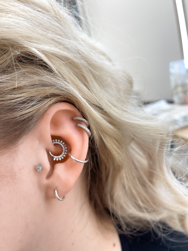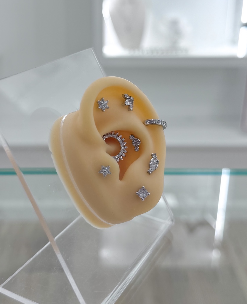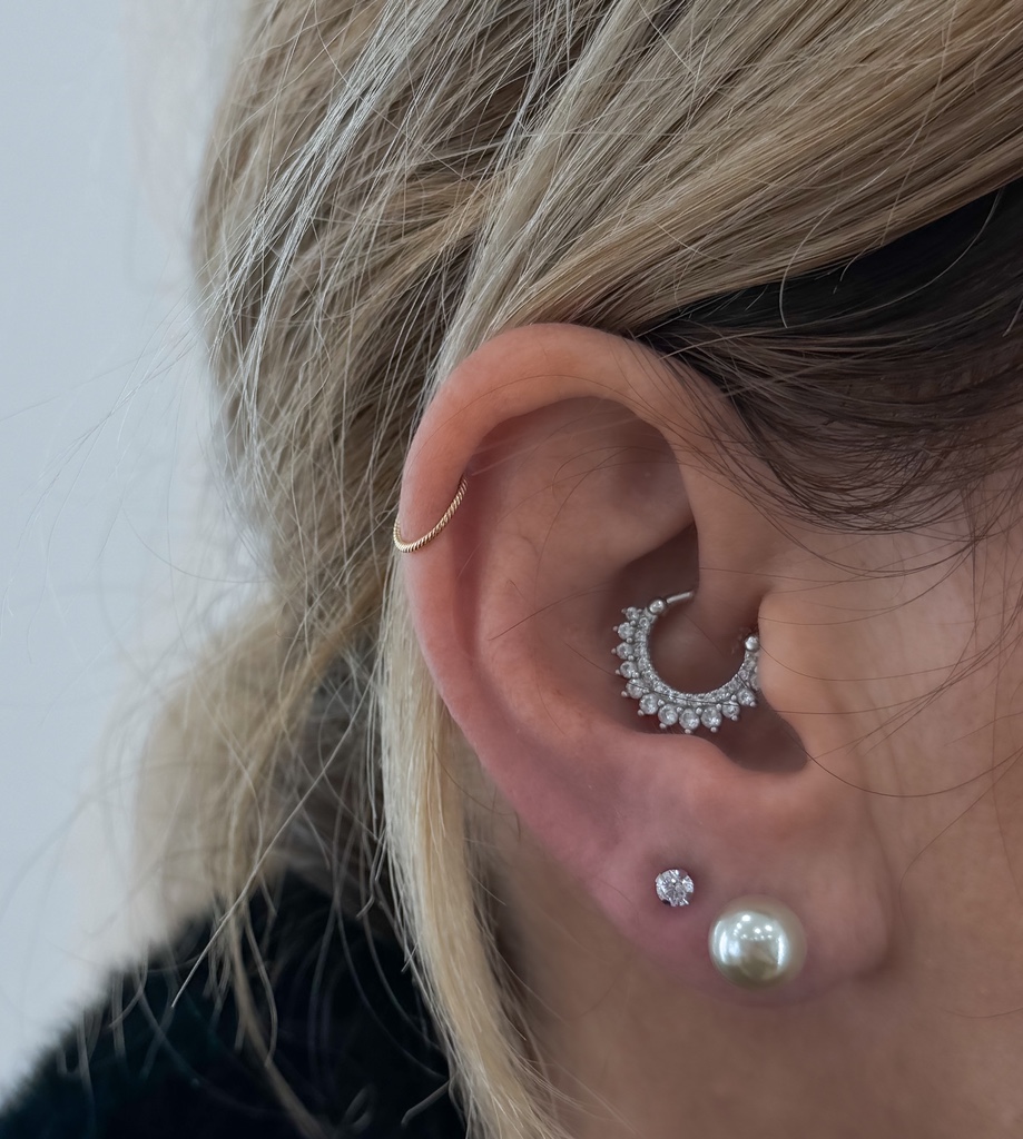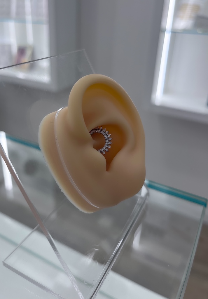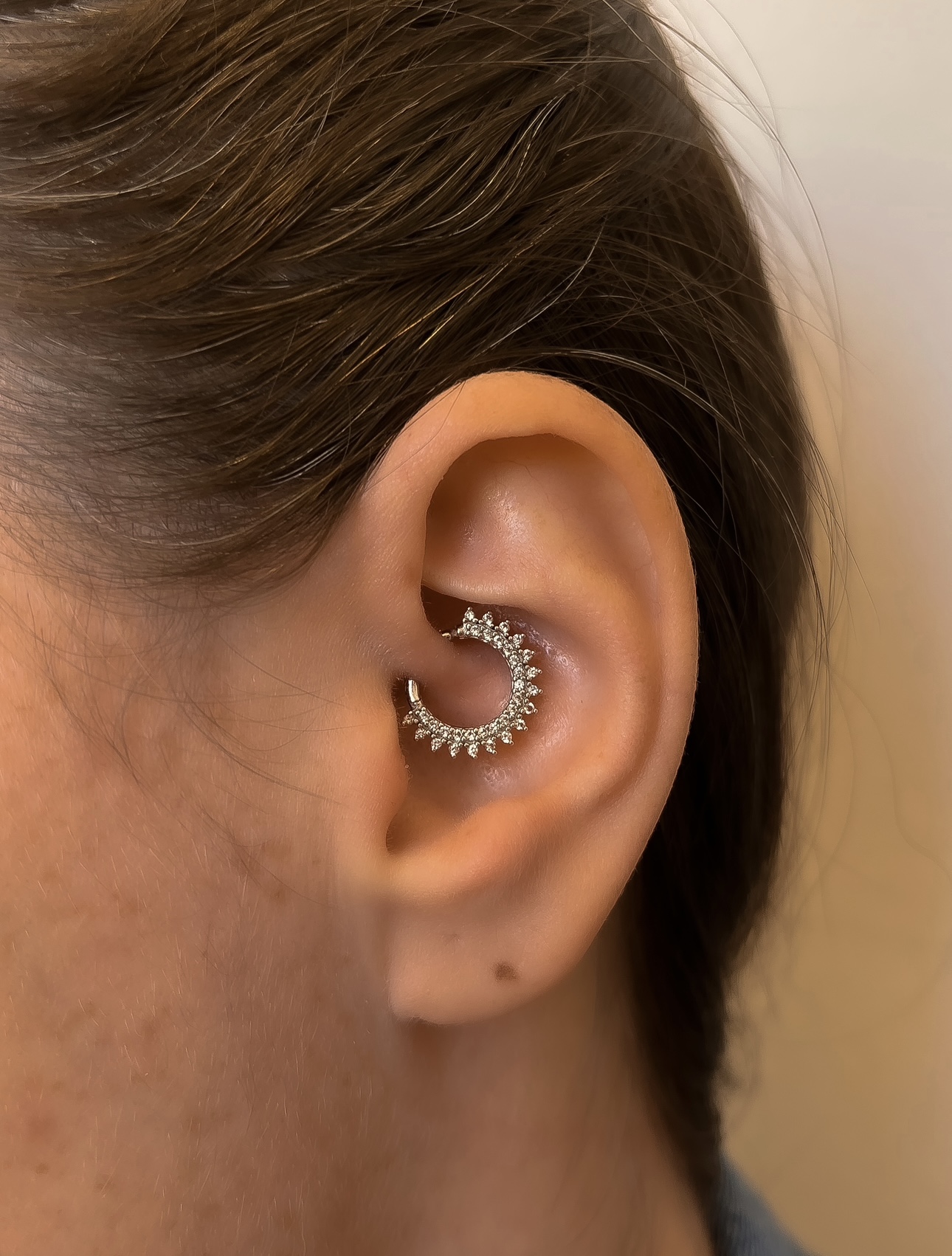 Lépj be a ragyogás világába ezzel a kifinomult, mégis látványos daith/migrén piercinggel, amelyet elegánsan csillogó cirkónia kövek díszítenek. A piercing 925 ezüstből készült, amely nemcsak gyönyörű fényt ad, de bőrbarát és tartós viseletet is biztosít – ideális választás érzékenyebb bőrre is.