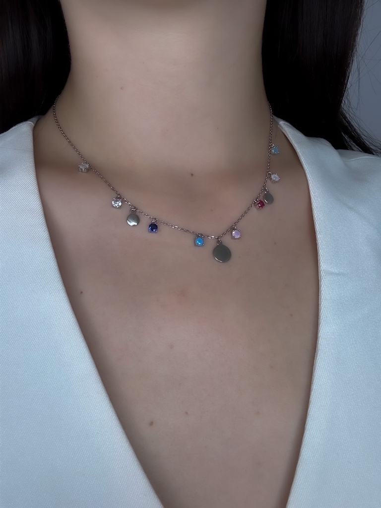 Ez a modern és játékos nyaklánc 925 sterling ezüstből készült, és változatos, apró függőkkel díszített. A láncot váltakozva színes cirkónia kövek és fényes, lekerekített ezüst medálok díszítik, amelyek egyedi és fiatalos megjelenést kölcsönöznek.