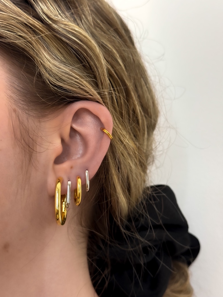Az ovális forma elegánsan nyújtja a megjelenést, és tökéletesen illik letisztult vagy akár merészebb stílusokhoz is. A fülbevaló két méretben érhető el, így könnyen igazítható egyéni ízléshez vagy alkalomhoz.