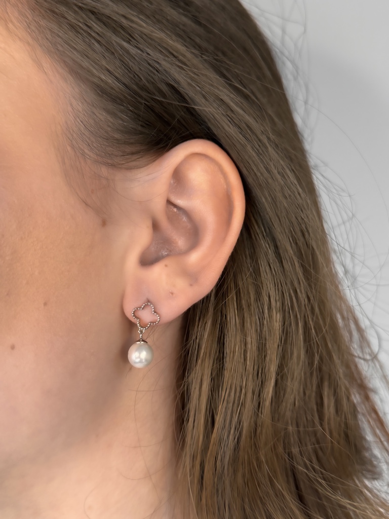 Ez a finoman kidolgozott, kifinomult stílusú fülbevaló egy különleges kombinációja a klasszikus és modern elemeknek. A felső részt egy négylevelű virágot idéző, áttört motívum díszíti, apró részletekkel keretezve. Az elegáns, fényes gyöngyhatású függő lágy mozgással egészíti ki a dizájnt, így minden mozdulatnál finoman megcsillan a fényben.