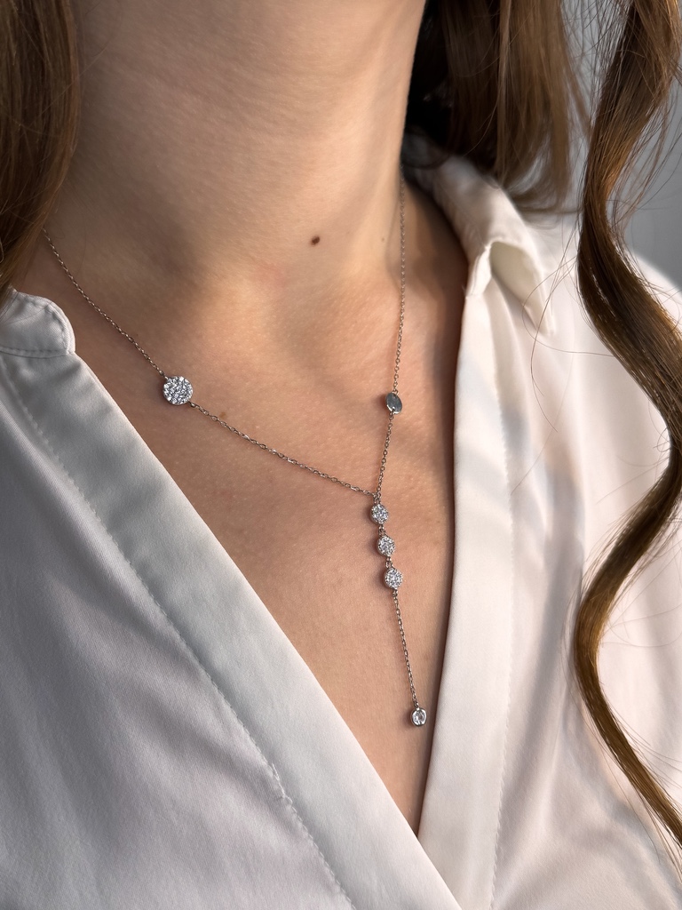 Az aszimmetrikus elrendezés modern és nőies hatást kelt, miközben a klasszikus ezüst szín időtálló eleganciát kölcsönöz az ékszernek. A lánc több apró, csillogó díszítése játékosan tükrözi vissza a fényt, különösen alkalmi vagy esti viselethez párosítva válik igazán látványossá. A nyaklánc hossza kényelmes, a karcsú láncszemek pedig biztosítják, hogy a medál szabadon és szépen essen a nyak vonalán.