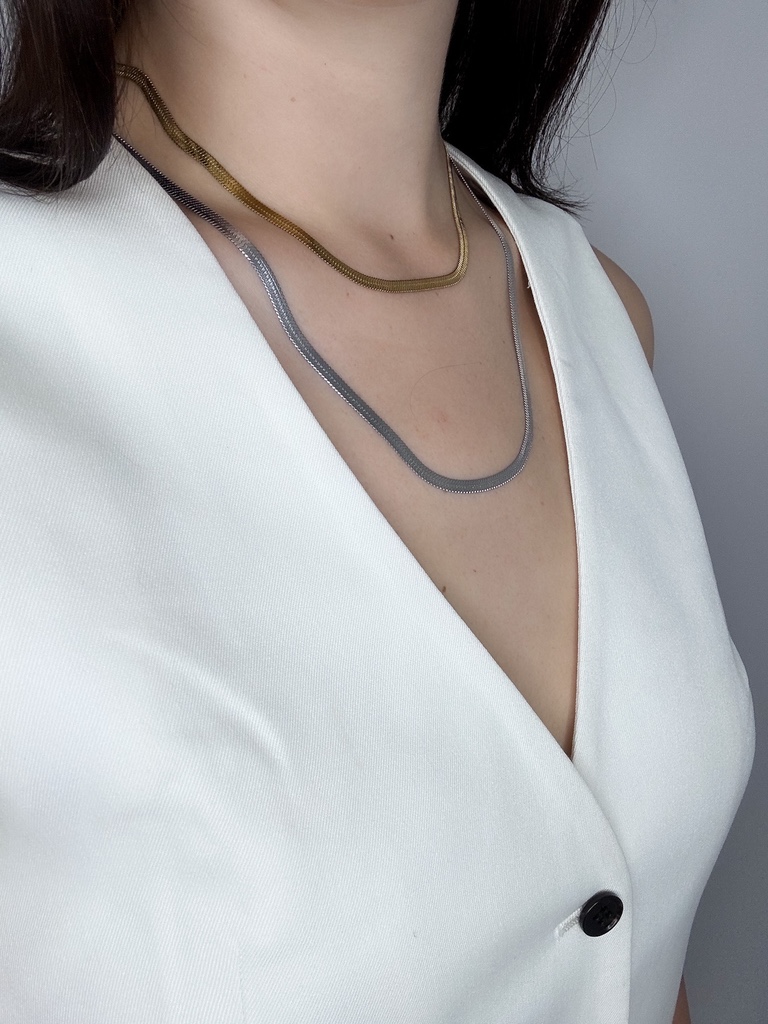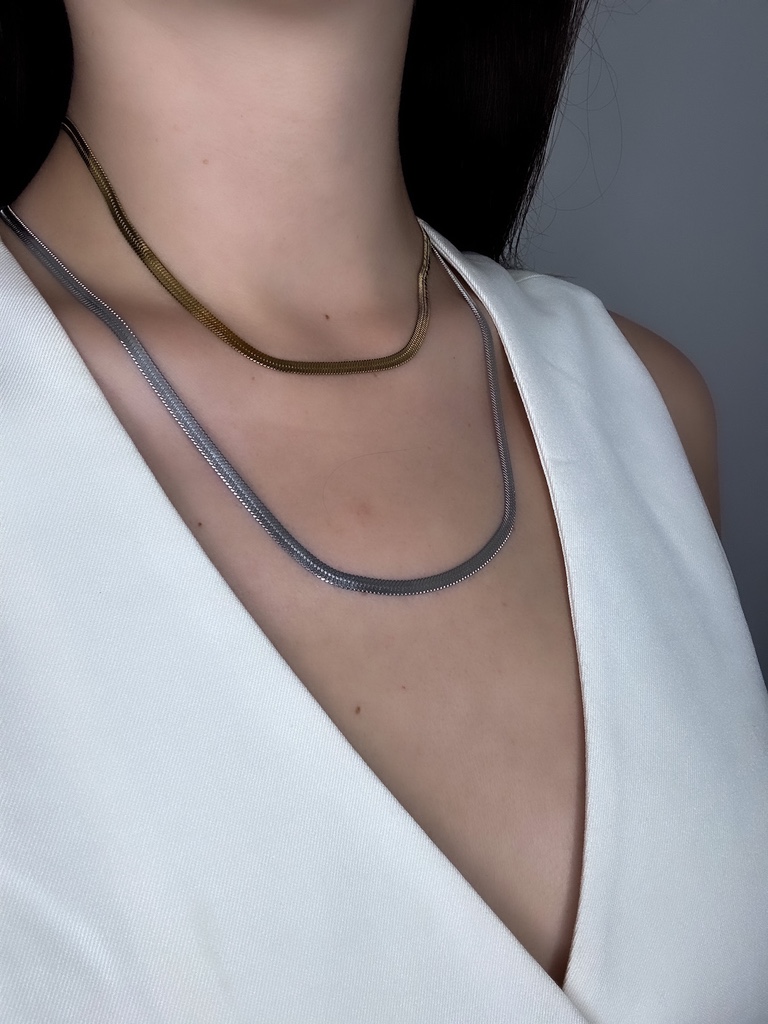 A Horizon nyaklánc a klasszikus eleganciát modern köntösbe bújtatja. Különleges, lapos “snake/kígyó” fonása selymesen simul a nyakra, diszkrét, mégis feltűnő csillogást kölcsönözve minden megjelenéshez. Prémium minőségű, hipoallergén nemesacélból készül, így nem színeződik, vízálló, és érzékeny bőrűek számára is ideális választás. A Horizon nyaklánc tökéletes önmagában is, de más láncokkal rétegezve is igazán stílusos. Válaszd ezt az időtálló darabot, ha szereted a letisztult, mégis karakteres ékszereket!
