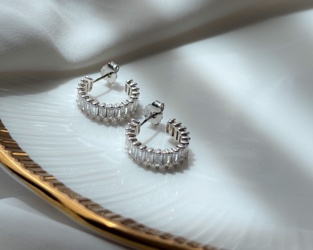 Ez a kifinomult karika fülbevaló valódi 925 ezüstből készült, és minden részletében az eleganciát képviseli. A teljes felületét baguette csiszolású cirkónia kövek díszítik, amelyek lenyűgözően szikráznak a fényben. Különleges alkalmakhoz és stílusos hétköznapokra egyaránt tökéletes választás. Finoman csillogó, mégis időtálló darab minden ékszergyűjteménybe.