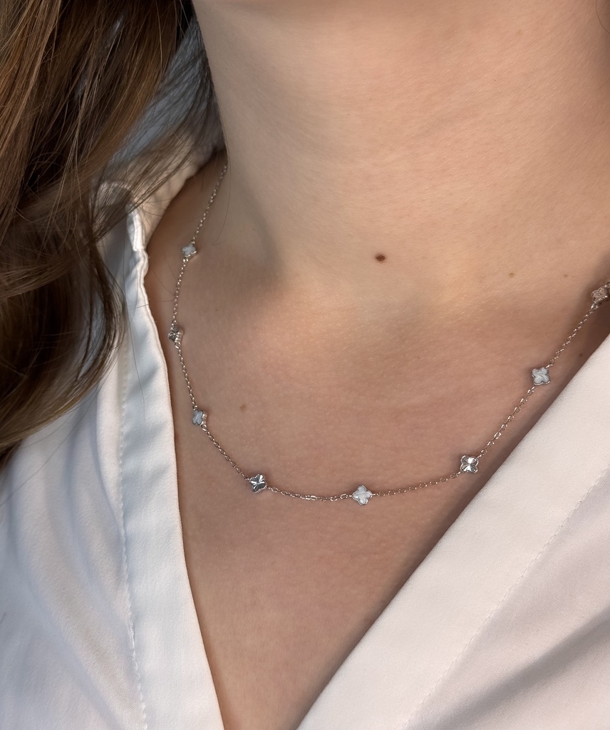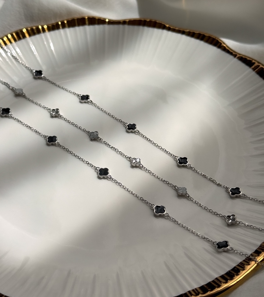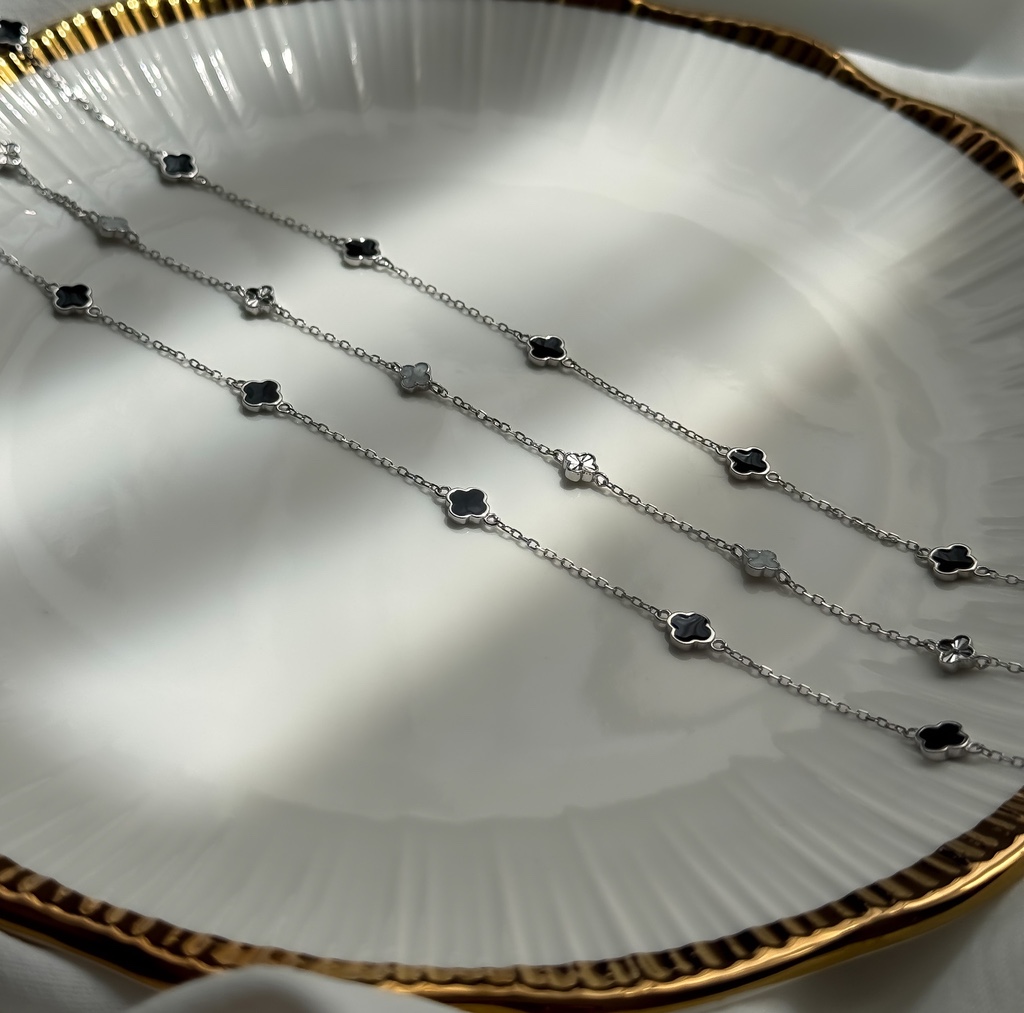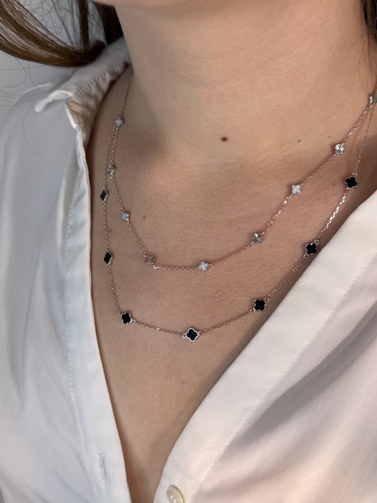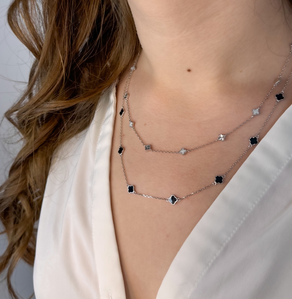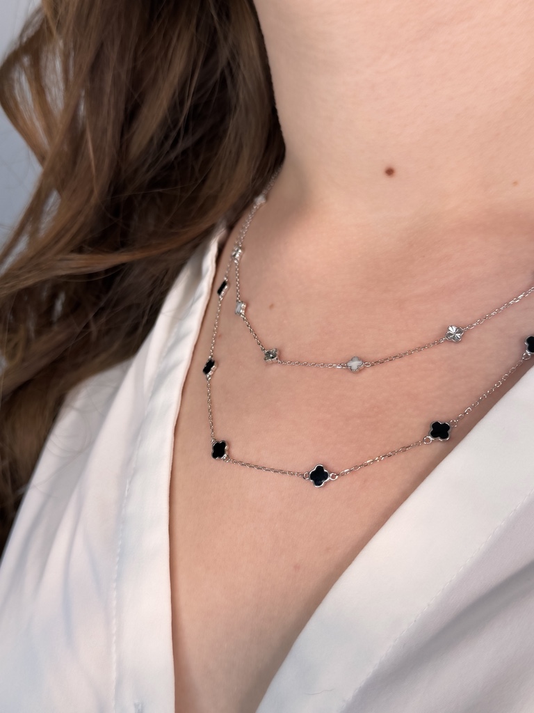 Ez a kifinomult, 925-ös finomságú ezüstből készült nyaklánc két stílusváltozatban is elérhető, így könnyedén igazítható a személyes ízlésedhez. Az egyik variáció elegáns váltakozással kombinálja a tört fehér és a finoman vésett ezüst medálokat, míg a másik változat letisztultan egységes, kizárólag fekete díszekkel elérhető. A négylevelű formákat idéző medálok a szerencse és a stílus szimbólumai, így ez a nyaklánc nemcsak elegáns, hanem különleges jelentést is hordoz. Viseld önmagában vagy rétegezve más ékszerekkel – a hatás garantált!