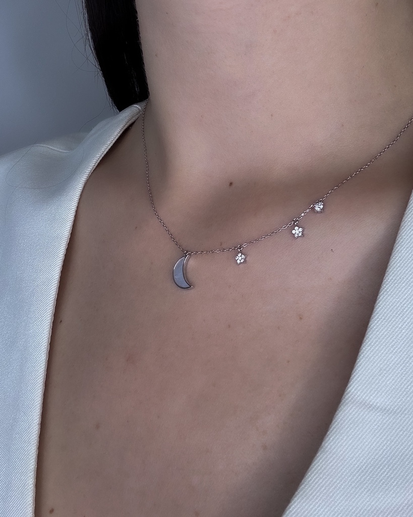Ez az elegáns, 925-ös finomságú ezüst nyaklánc finom részleteivel hívja fel magára a figyelmet. A láncot négy medál díszíti: két csillag alakú, egy klasszikus kerek függő, valamint a központi elemet képező, letisztult hold alakú medál.
