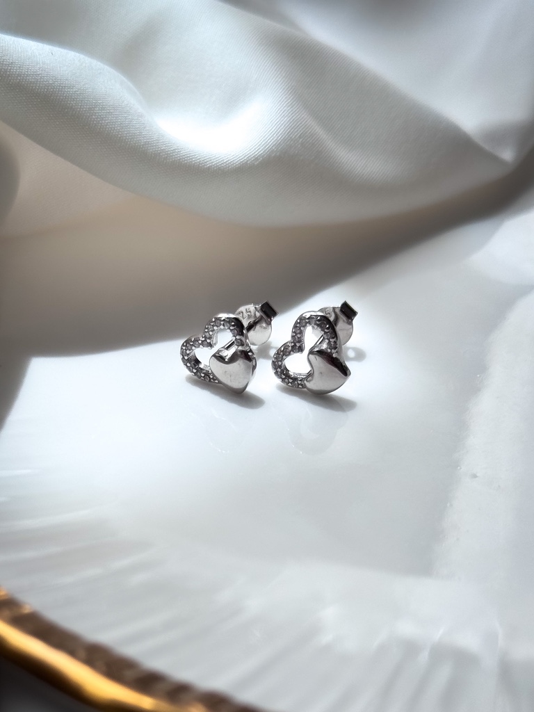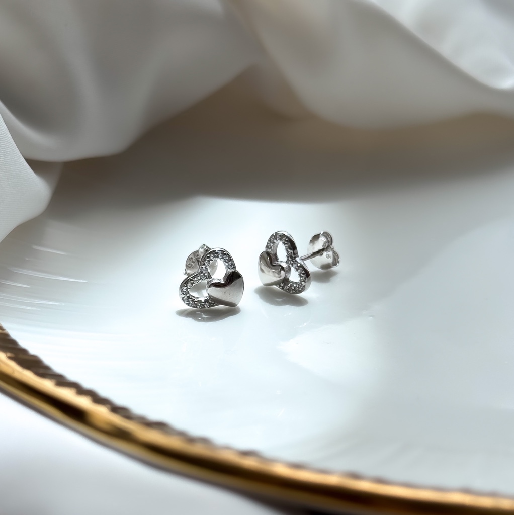 Egy ékszer, ami szívből szól. Ez az elegáns beszúrós fülbevaló két egymásba fonódó szívet ábrázol: az egyik fényes, tömör szív, míg a másik finoman kirakott ragyogó cirkónia kövekkel. A kettő együtt harmonikus, mégis karakteres megjelenést ad – tökéletes választás ajándéknak vagy saját magadnak.