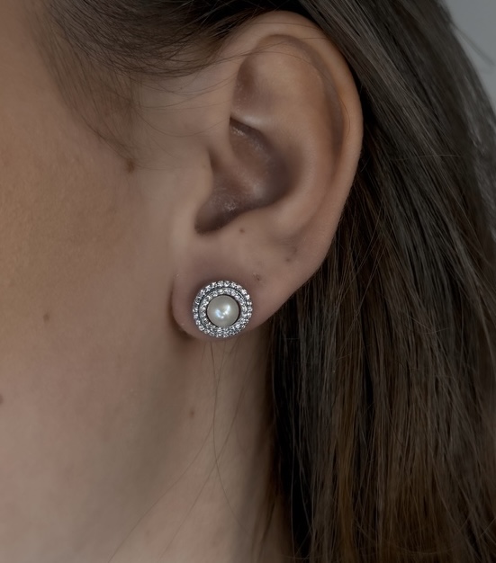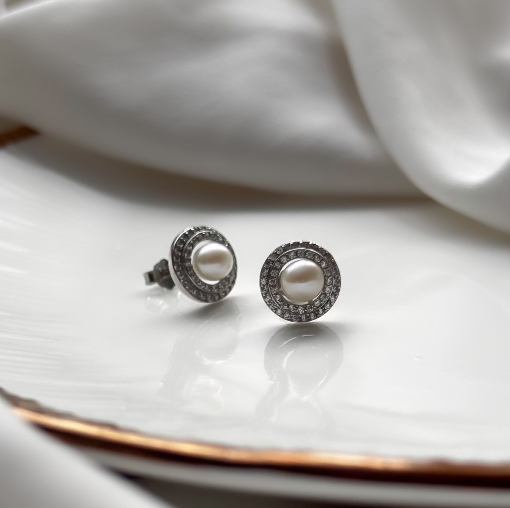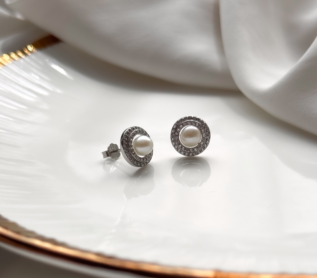 Anyag: 925 ezüst I Díszítés: gyöngyhatású közép és cirkónia köves dupla keret I Záródás: bedugós I Megjelenés: elegáns, romantikus, klasszikus