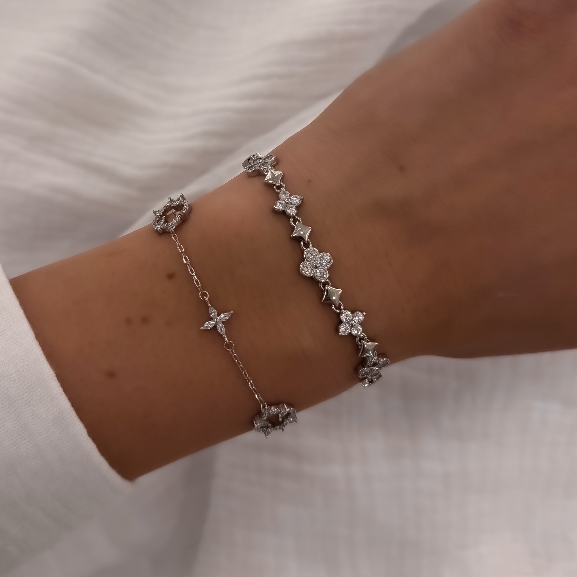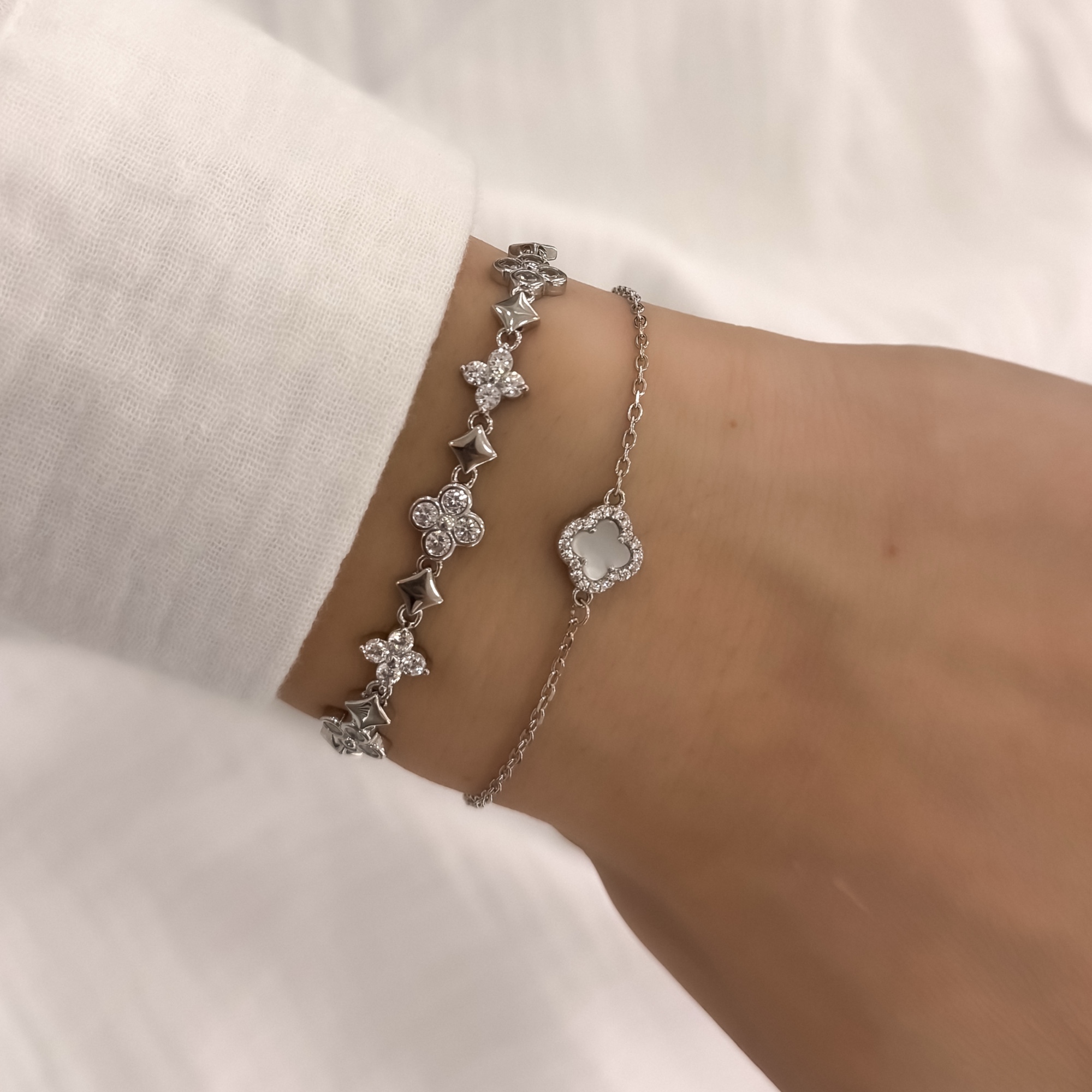 Kifinomultság és modern elegancia egyetlen ékszerben: a Stella karkötő káprázatos részletgazdagságával és finom kidolgozásával azonnal magára vonja a figyelmet. A 925 ezüstből készült karkötő váltakozó mintázatú – csillogó, lóherét idéző motívumait apró, ragyogó cirkónia kövek díszítik, melyeket fémesen fénylő geometrikus elemek egészítenek ki.