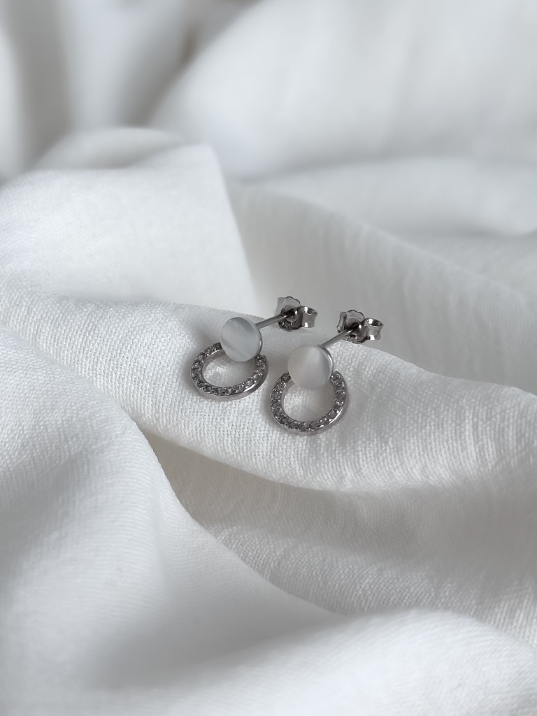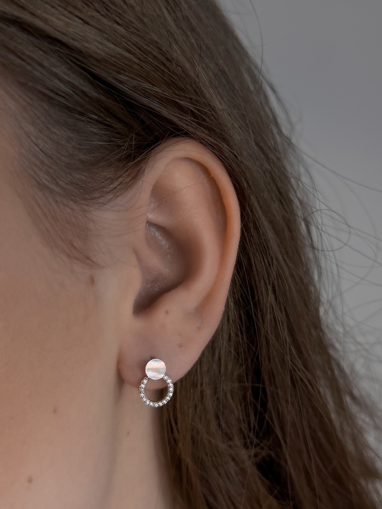 Anyag: S925 sterling ezüst (beütéssel) I Díszítés: Gyöngyház hatású korong + cirkóniával kirakott kör I Záródás: Stekkeres (bedugós) I Stílus: Modern elegancia I Könnyű, kényelmes viselet